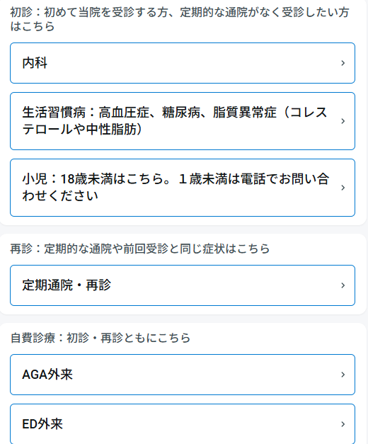 当院のWEB予約項目・問診票は以下のように分類されています。